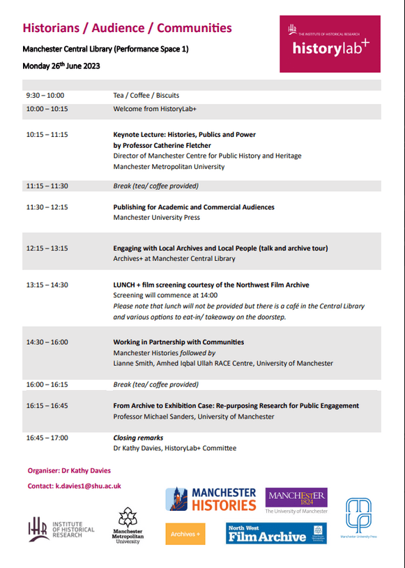 Featuring a keynote lecture on ‘Histories, Publics and Power’ by Professor Catherine Fletcher (Director of the Manchester Centre for Public History and Heritage, Manchester Metropolitan University), Historians/Audiences/Communities will provide the tools and time to look outward, make connections, and think beyond the traditional parameters of academic work.